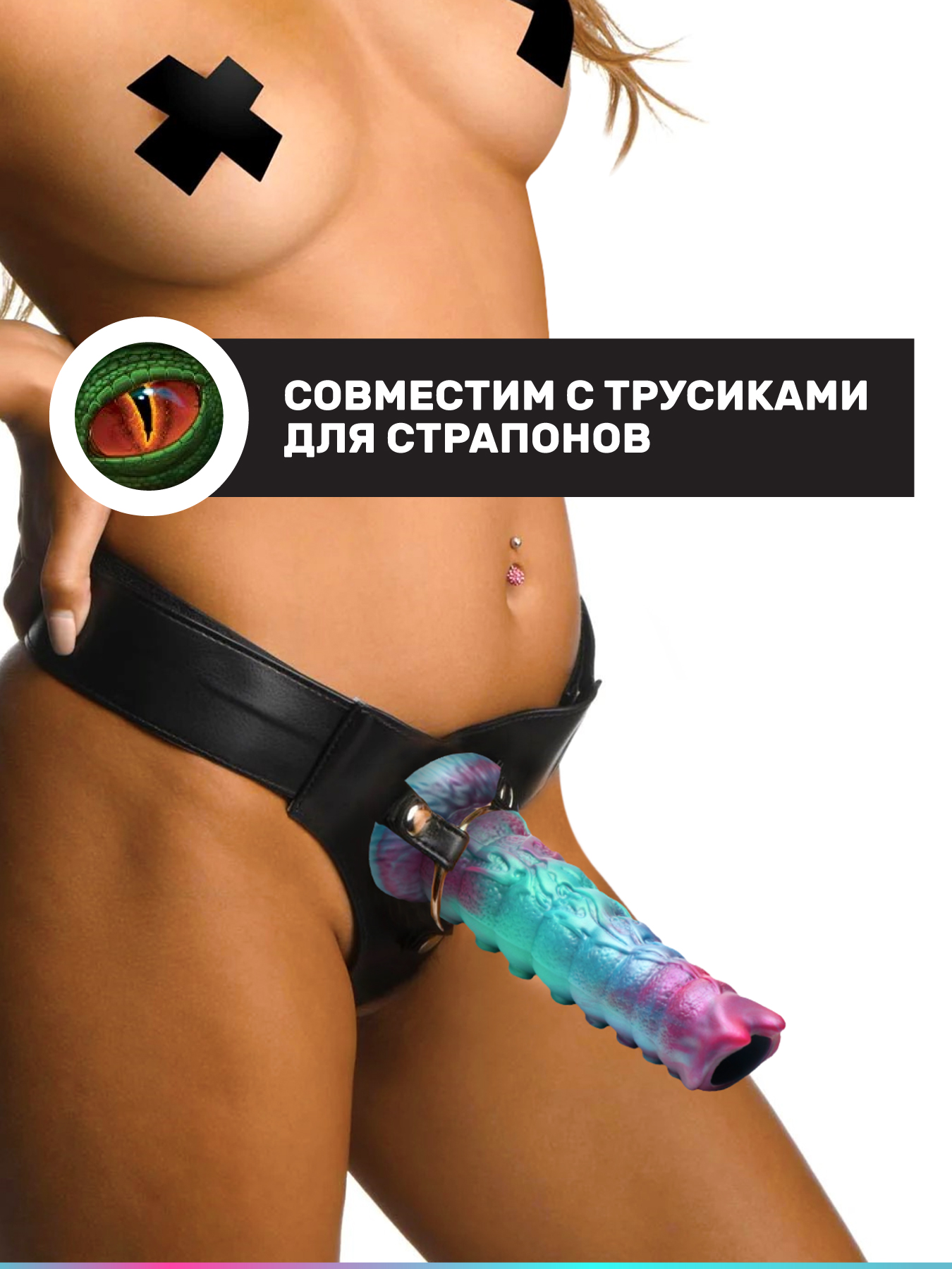 Сегментированный стержень имеет текстурированные выпуклости и открытый кончик, в который помещаются 4 мягкие вкладки. Широкое фланцевое основание делает его совместимым со страпоном.