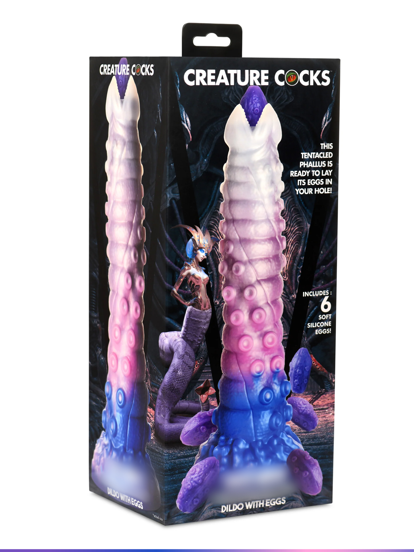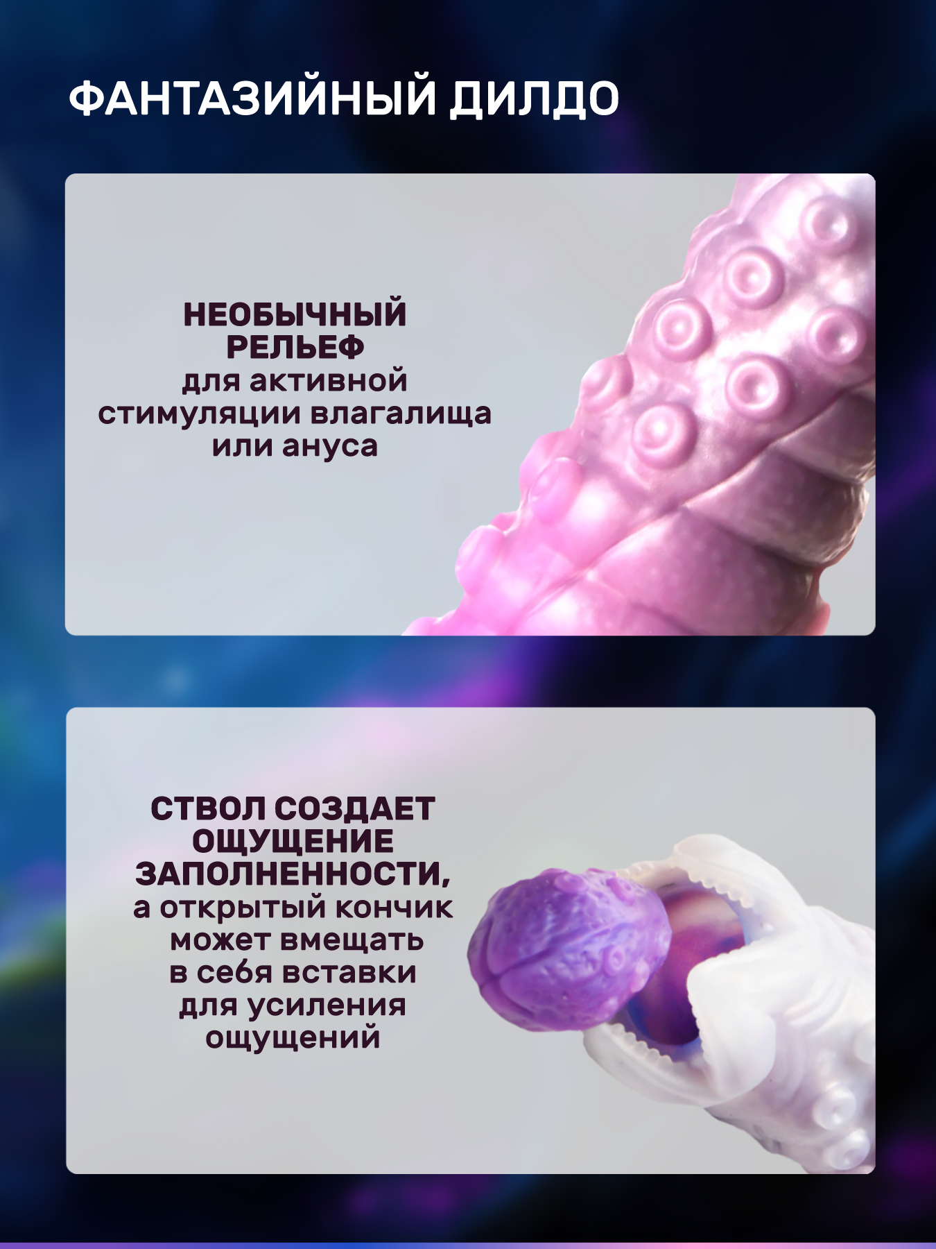 Яркий дилдо имеет уникальную текстуру со спиральными выступами и присосками. Головка представляет собой полость, через которую проскальзывают рельефные вкладки.