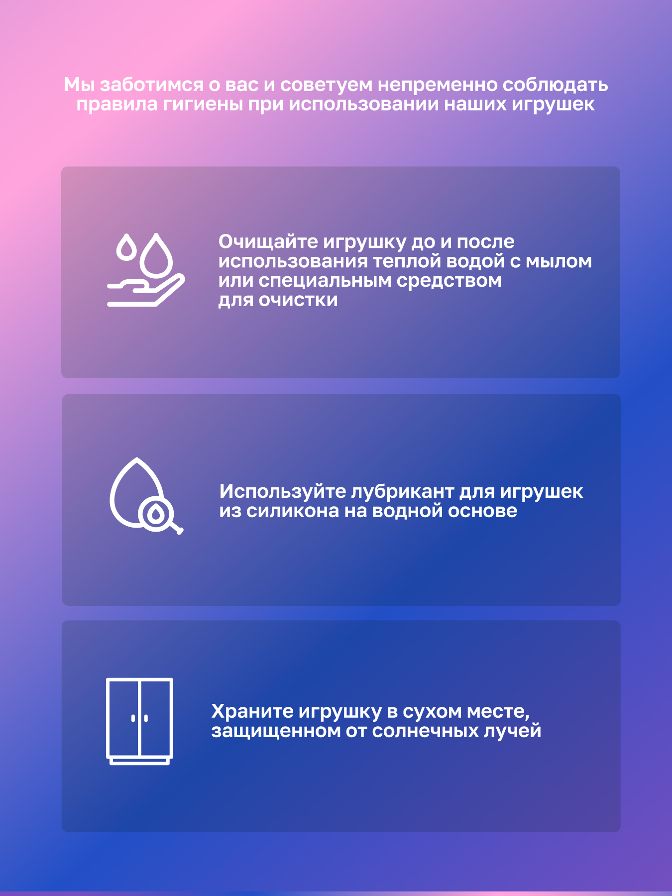 После окончания игры вымойте фаллоимитатор теплой водой с мылом и очистите его с помощью средства для чистки игрушек. Вытрите насухо и храните в прохладном, темном месте, защищенном от прямых солнечных лучей.