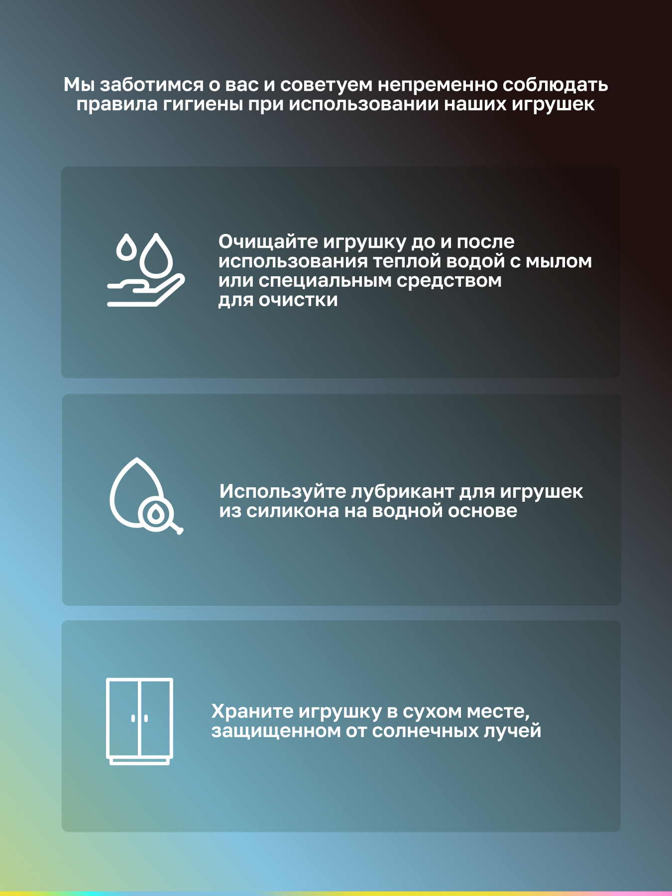 После окончания игры вымойте фаллоимитатор теплой водой с мылом и очистите его с помощью средства для чистки игрушек. Вытрите насухо и храните в прохладном, темном месте, защищенном от прямых солнечных лучей.