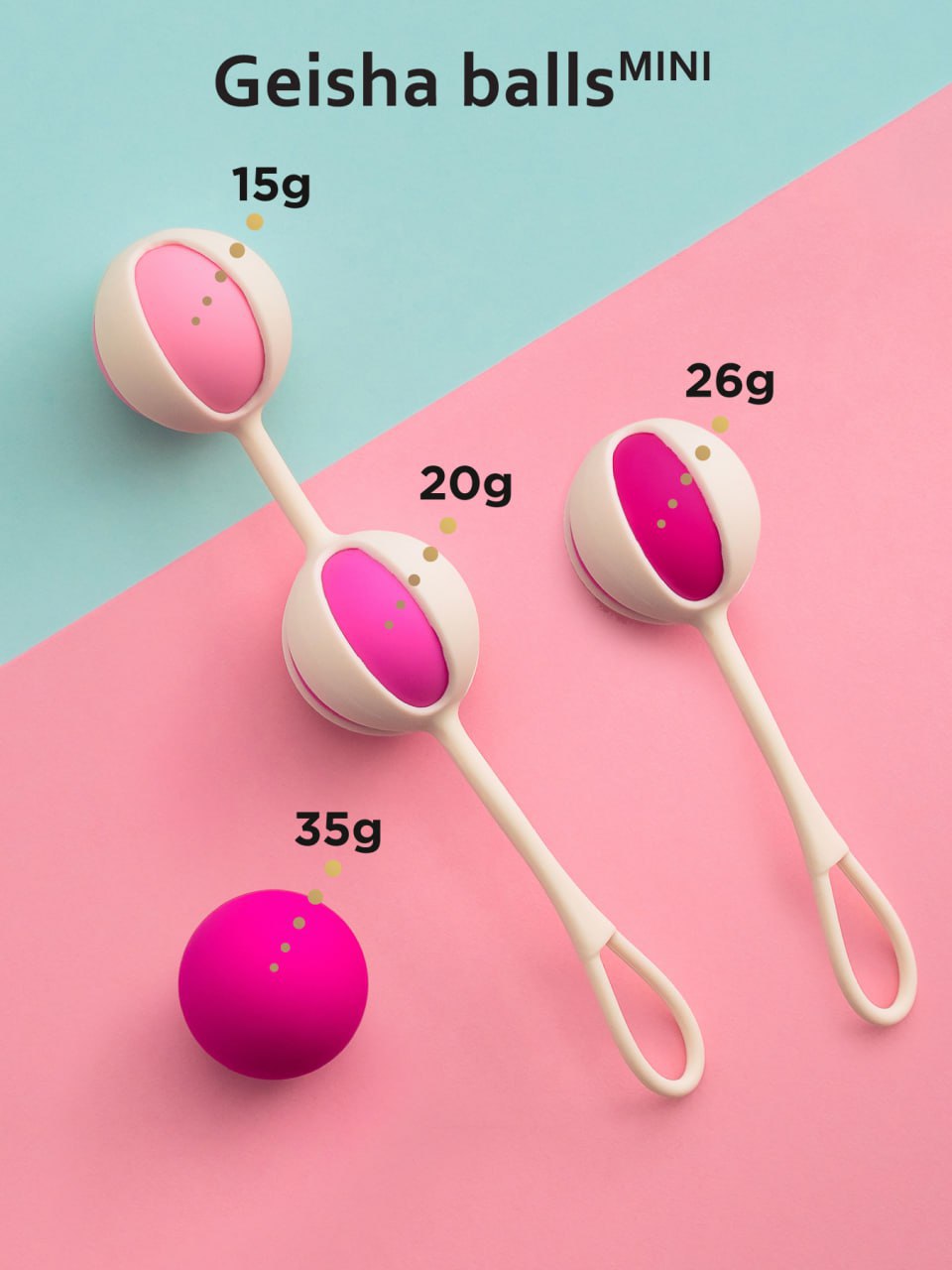 Наш стартовый набор Gvibe Geisha Balls Mini содержит 4 шарика разного веса – от 15г до 35г, а также два силиконовых ремешка – для одного шарика и для двух. Малый вес и уменьшенный диаметр шариков идеально подходят для начинающих.