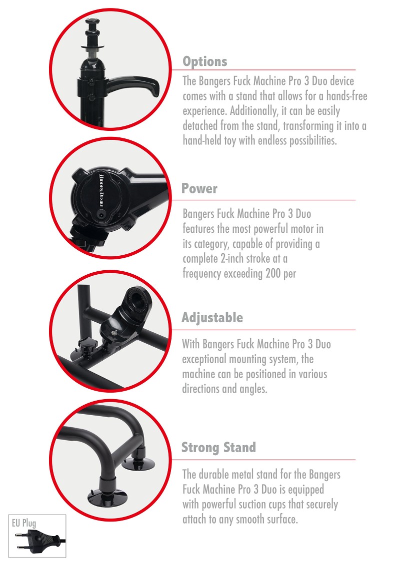 Опции: Bangers Fuck Machine Pro 3 Duo поставляется с подставкой, позволяющей освободить руки. Кроме того, его можно легко снять с подставки, превратив в ручную игрушку с безграничными возможностями.