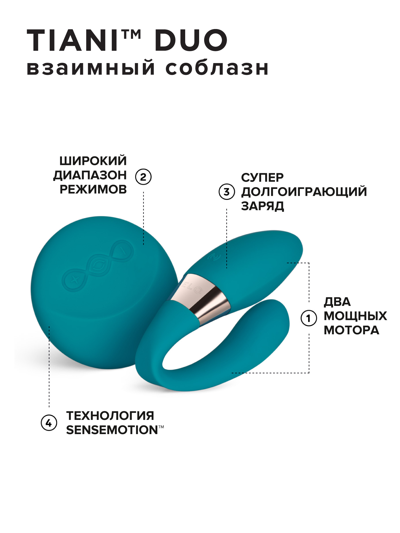 - LELO Tiani Duo — это вибратор для пар с двумя мощными моторами, специально разработанный для тех, кто хочет углубить интимную связь. Он удобно изгибается так, чтобы соответствовать любой форме тела, позволяя вам достичь синхронного, гармоничного оргазма. Игрушка покрыта мягким силиконом премиального качества, поэтому пользоваться ей комфортно и безопасно.