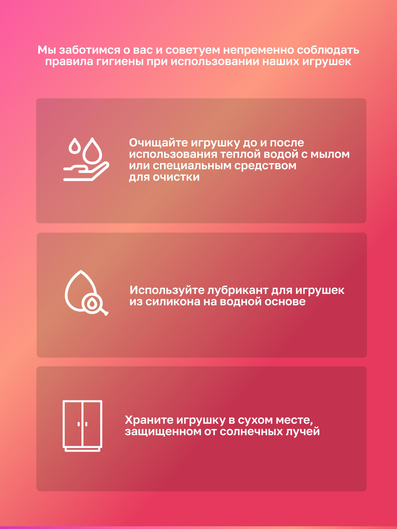 После окончания игры вымойте дилдо теплой водой с мылом и используйте очиститель для игрушек, чтобы очистить. Вытрите насухо и храните в прохладном, темном месте, защищенном от прямых солнечных лучей.