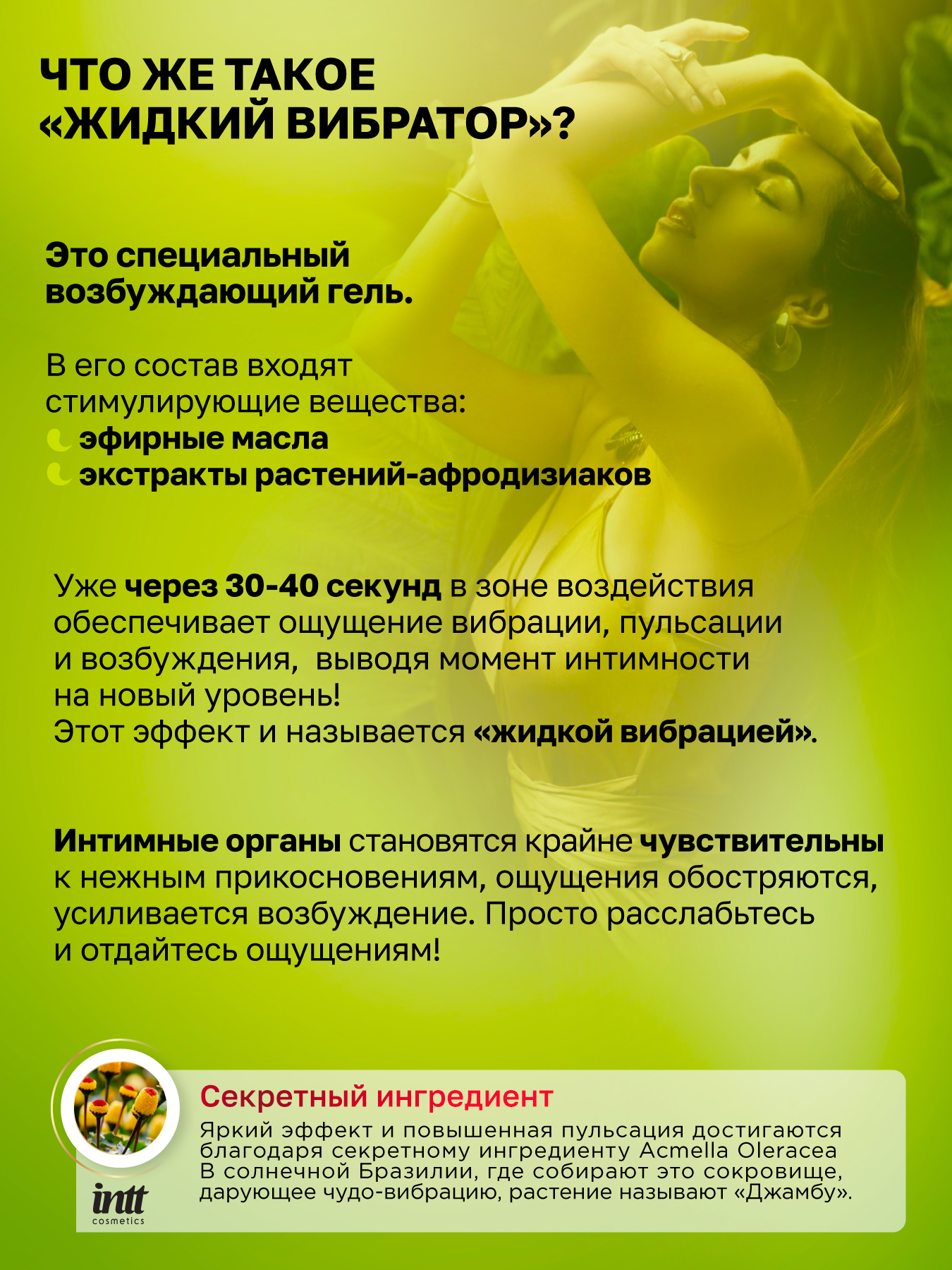 Жидкий вибратор представляет собой гель на основе натуральных растений северо-востока Бразилии, который при нанесении на интимную область обеспечивает ощущение вибрации, пульсации и возбуждения выводя момент интимности на новый уровень.