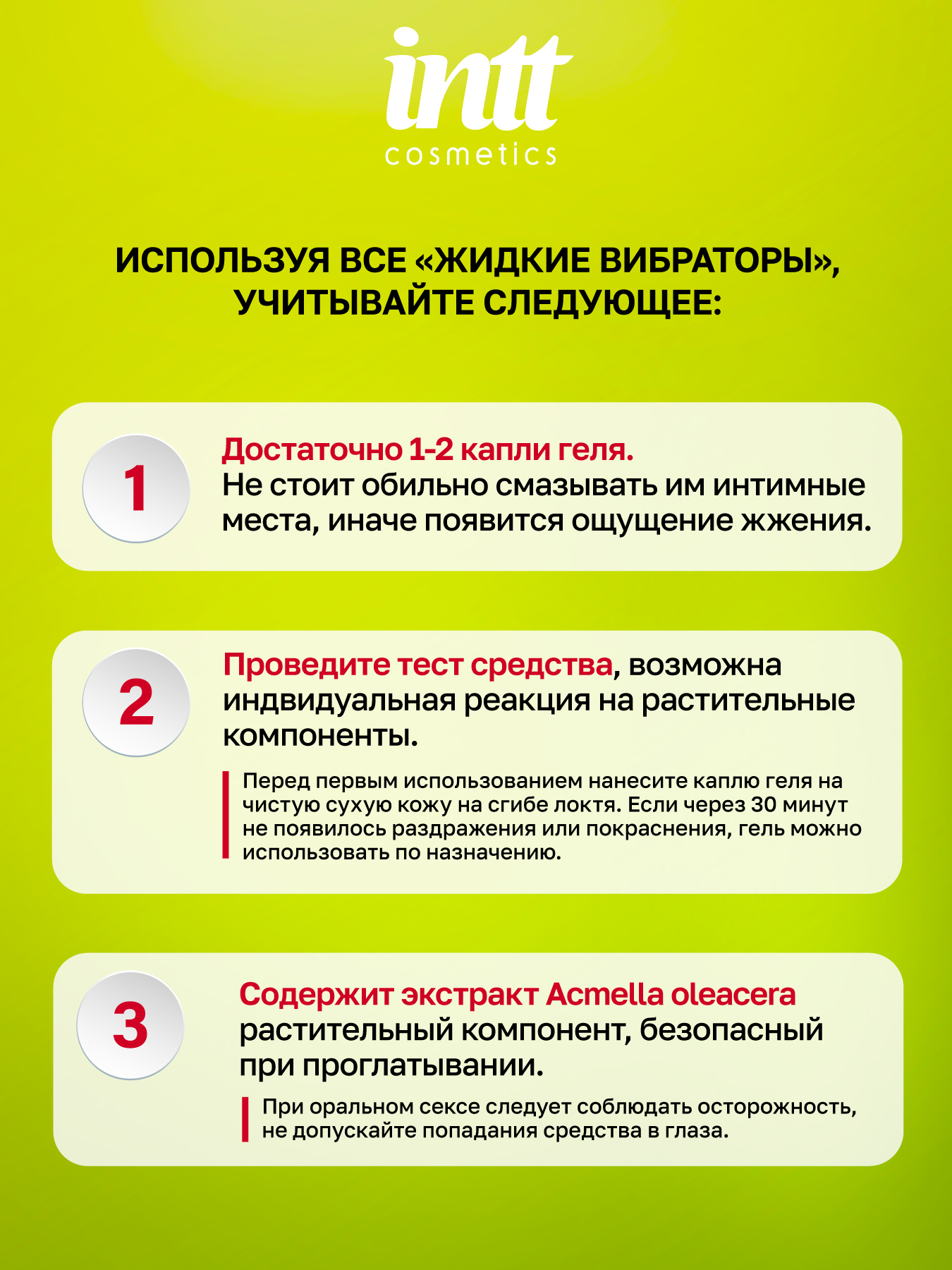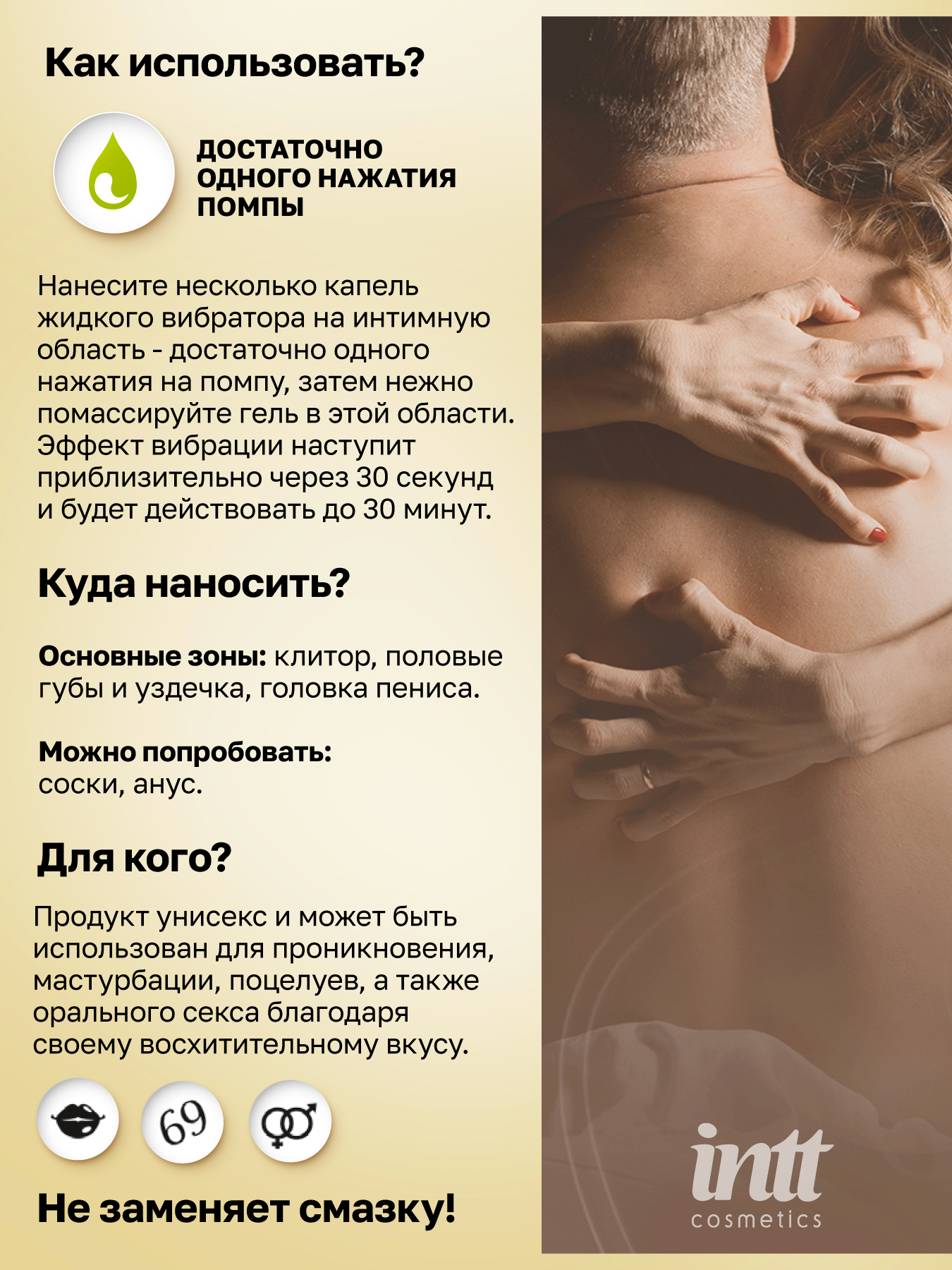 - нанесите пару капель жидкого вибратора прямо на губы и целуйте своего партнера, куда захотите, переходя к оральным ласкам! Настройтесь на максимум!