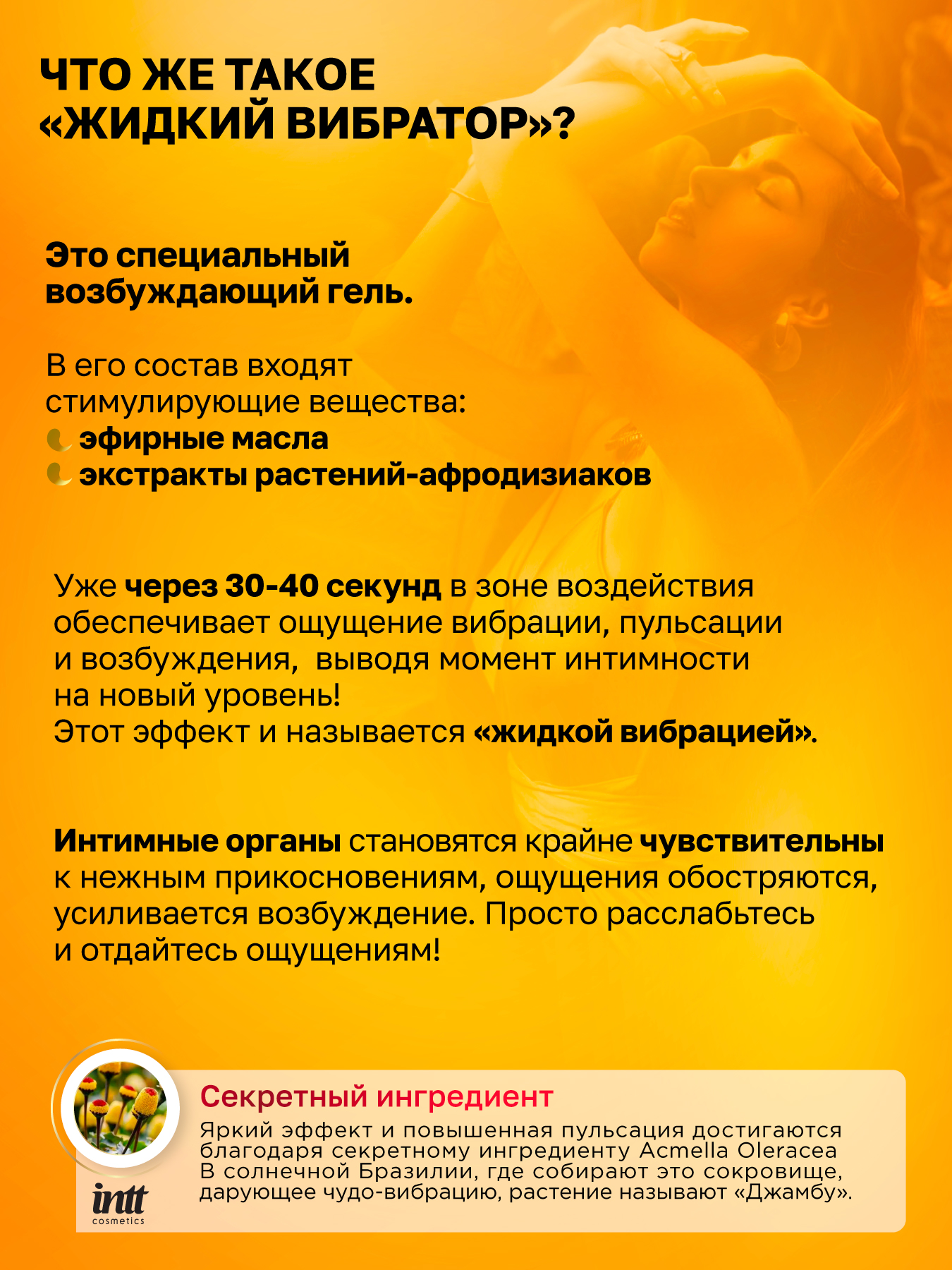 Жидкий вибратор представляет собой гель на основе натуральных растений северо-востока Бразилии, который при нанесении на интимную область обеспечивает ощущение вибрации, пульсации и возбуждения выводя момент интимности на новый уровень.