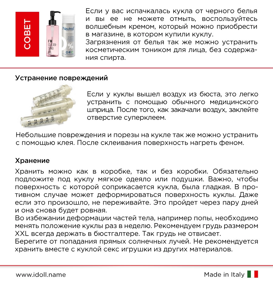 1. Для куколки настоятельно не рекомендуем использовать цветное белье, так как оно может окрашивать и оставлять следы на ее коже. Только белого цвета.