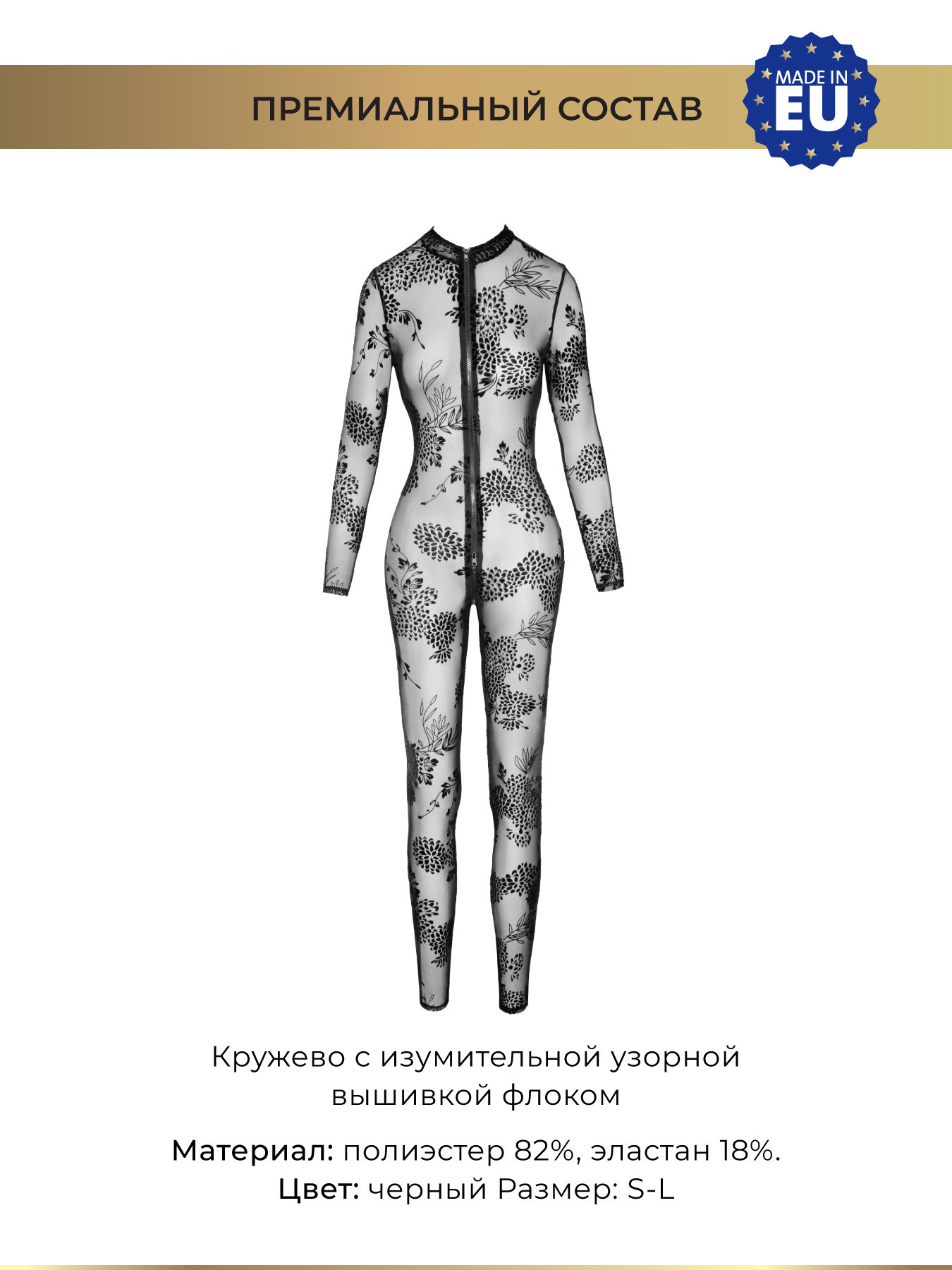 Этот сексуальный длинный комбинезон из кружева украшен флоковой вышивкой и длинной трехзамковой молнией от воротника до промежности.