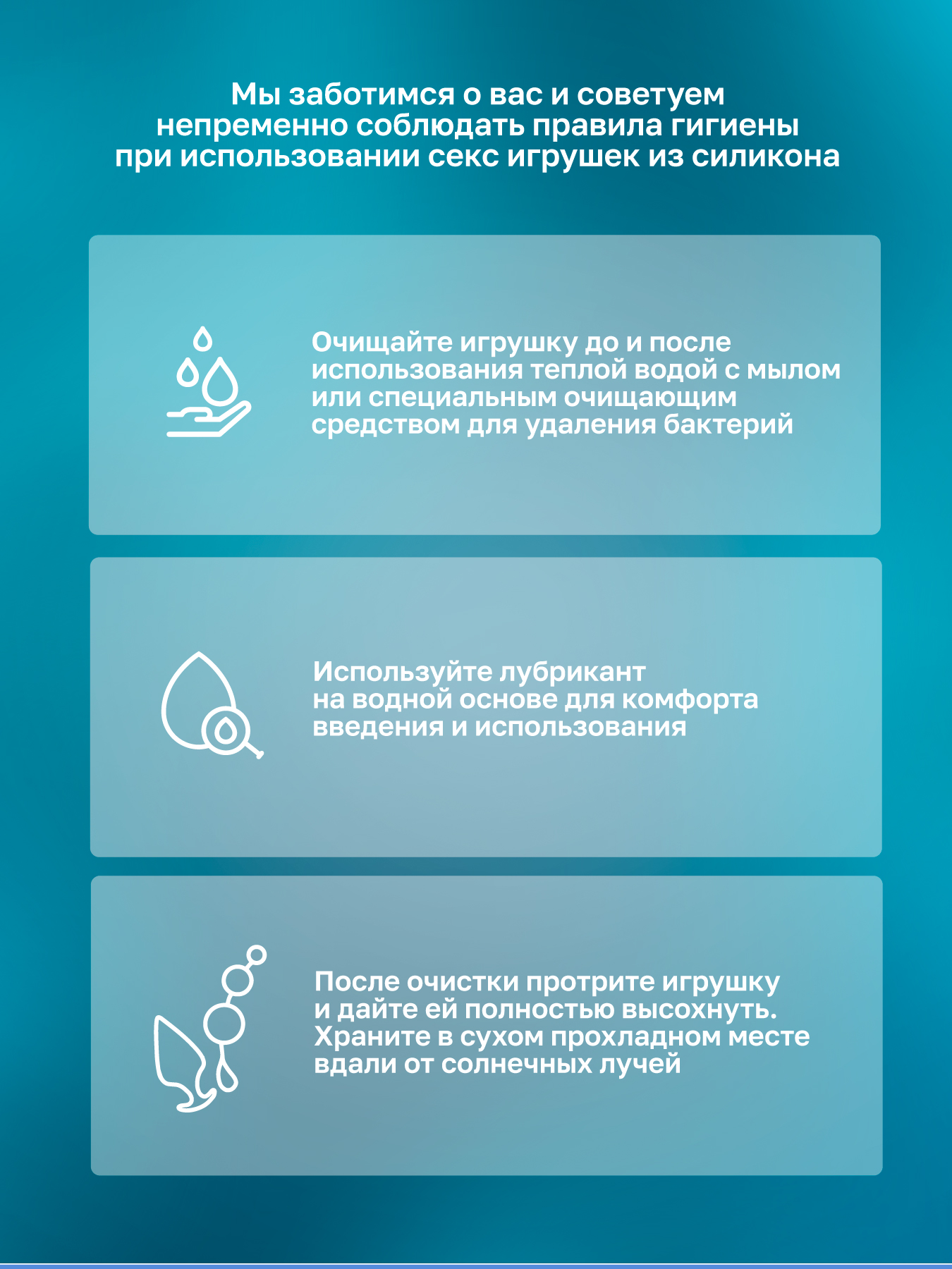 Используйте со смазками только на водной основе. После использования промойте теплой водой с мягким мылом и обработайте средством для очистки секс игрушек. Храните отдельно от других изделий из силикона.