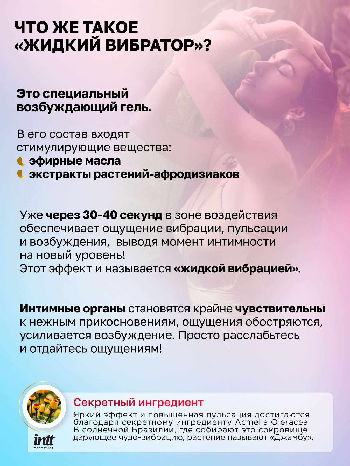 Жидкий вибратор представляет собой гель на основе натуральных растений северо-востока Бразилии, который при нанесении на интимную область обеспечивает ощущение вибрации, пульсации и возбуждения выводя момент интимности на новый уровень.